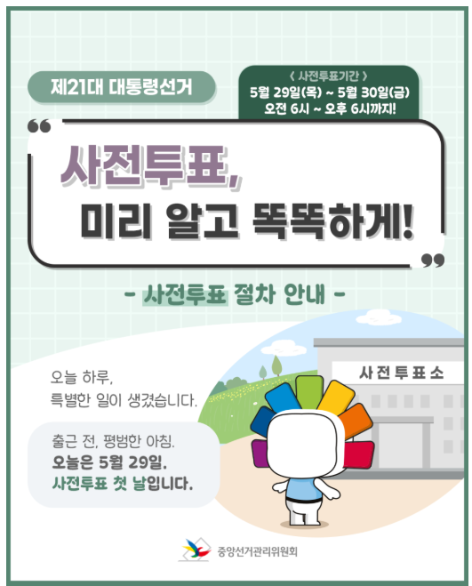 2025년 대통령선거의 사전투표는 5월 29일(목)부터 5월 30일(금)까지, 이틀간 진행됩니다.