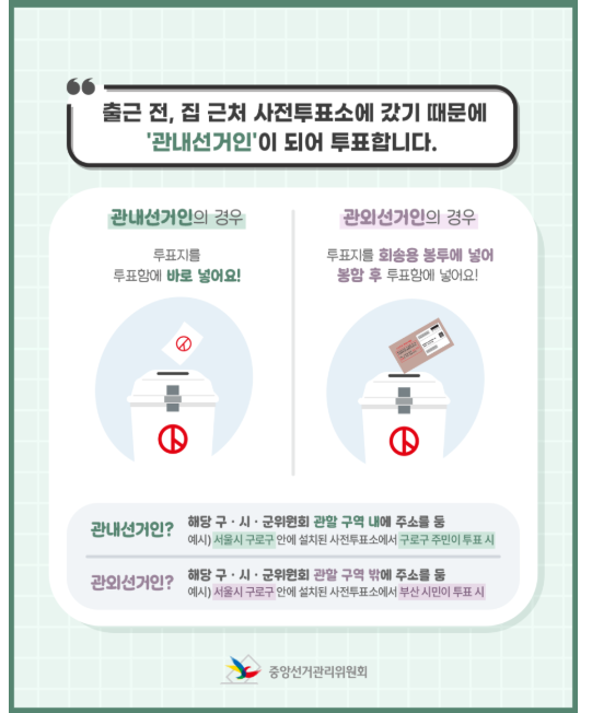 사전투표소에서의 투표 절차는 관내 선거인과 관외 선거인에 따라 다소 차이가 있습니다.